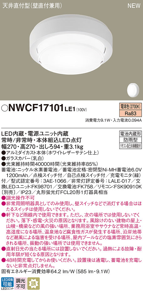 パナソニック NWCF17101LE1 防雨型シーリング階段灯 壁・天井直付型 フラット ホワイト低光束タイプ 585lm 電球色