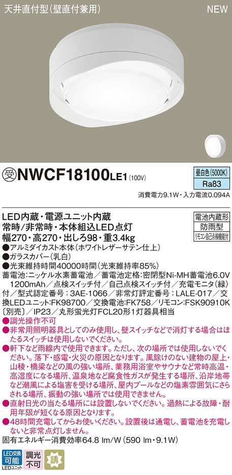 パナソニック NWCF18100LE1 防雨型シーリング階段灯 壁・天井直付型 フード ホワイト低光束タイプ 590lm 昼白色