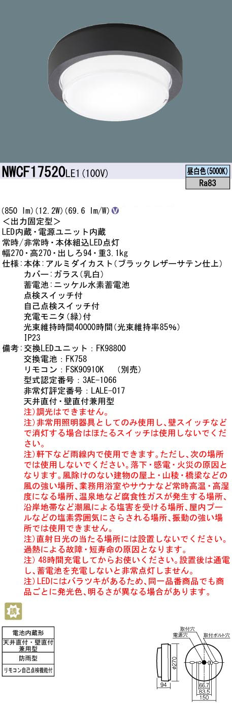 パナソニック NWCF17520LE1 防雨型シーリング階段灯 壁・天井直付型 フラット ブラック高光束タイプ 850lm 昼白色