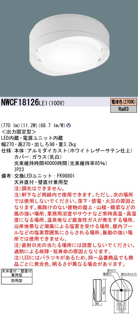 パナソニック NWCF18126LE1 防雨型シーリング階段灯 壁・天井直付型 フード ホワイト 高光束タイプ 770lm 電球色