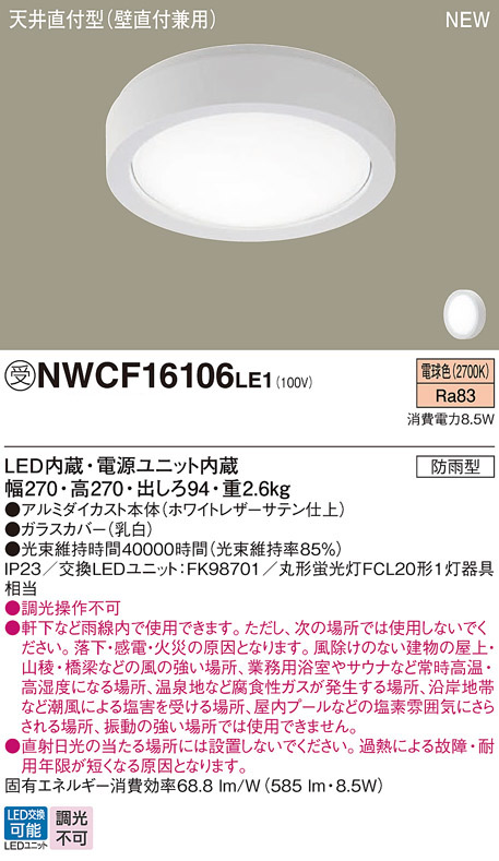 パナソニック NWCF16106LE1 防雨型シーリング階段灯 壁・天井直付型 ベーシック ホワイト 低光束タイプ 585lm 電球色