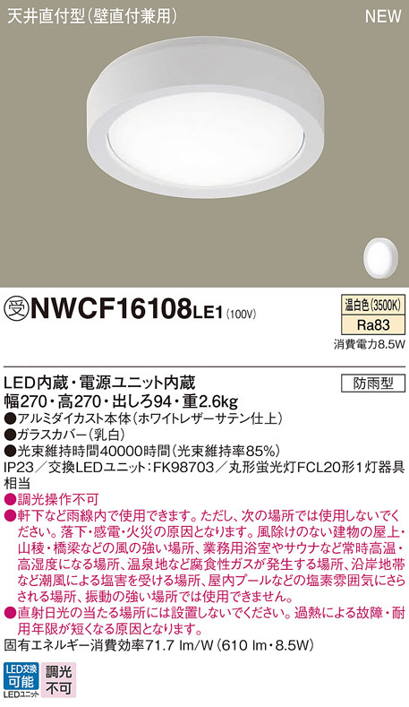 パナソニック NWCF16108LE1 防雨型シーリング階段灯 壁・天井直付型 ベーシック ホワイト 低光束タイプ 610lm 温白色