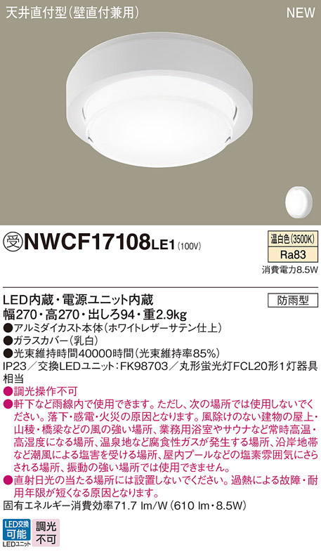 パナソニック NWCF17108LE1 防雨型シーリング階段灯 壁・天井直付型 フラット ホワイト 低光束タイプ 610lm 温白色
