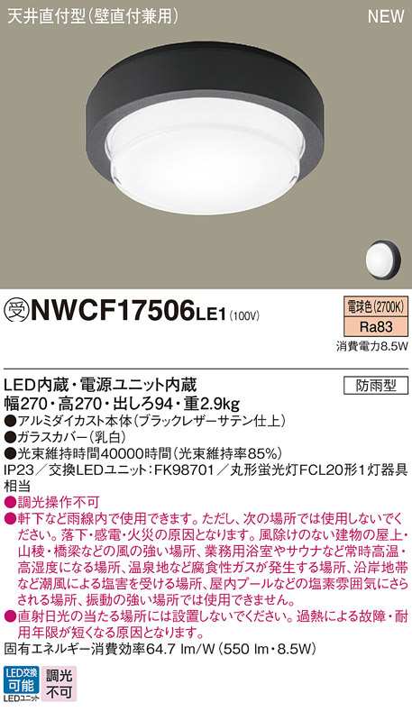 パナソニック NWCF17506LE1 防雨型シーリング階段灯 壁・天井直付型 フラット ブラック低光束タイプ 550lm 電球色