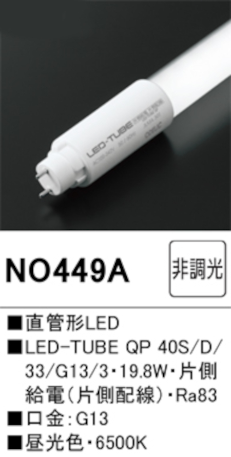 オーデリック NO449A 直管形LEDランプ 40形 非調光 片側給電・片側配線 Hf32W高出力相当 口金:G13 6500K 昼光色