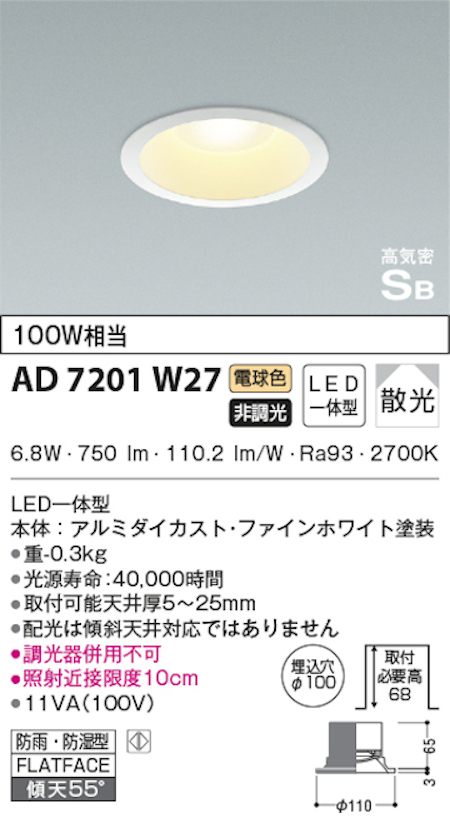コイズミ照明 AD7204W27 S形白枠広枠ダウンライト 125φ 防雨・防湿型 60W相当 非調光 電球色