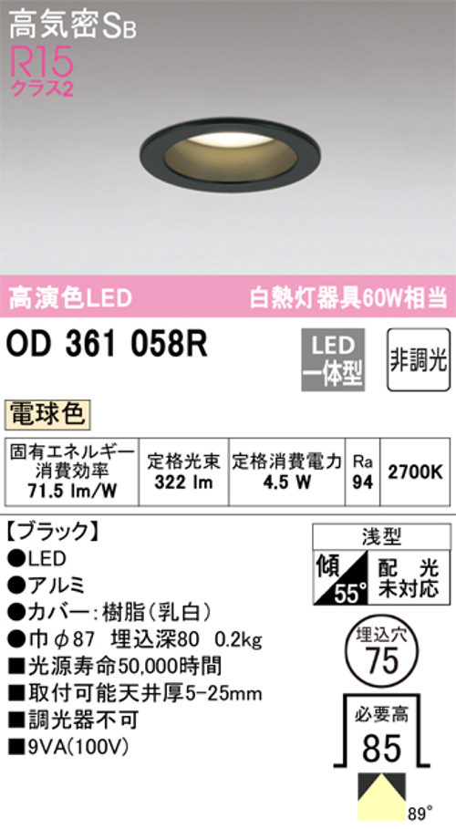 オーデリック OD361058R LED一体型ダウンライト 埋込穴Φ75 白熱灯60W相当 非調光電球色 ブラック