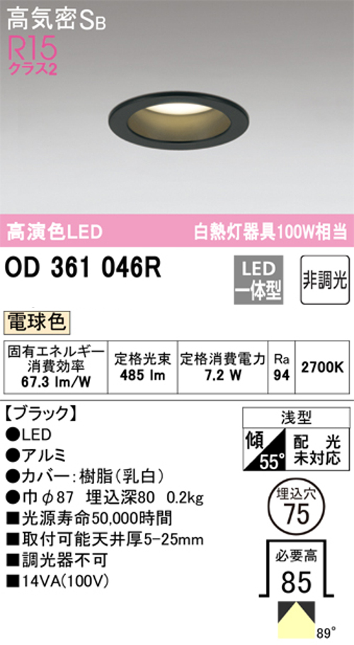 オーデリック OD361056R LED一体型ダウンライト 埋込穴Φ75 白熱灯60W相当 非調光昼白色 ブラック