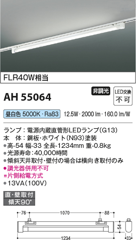 コイズミ照明 AH55064 LEDベースライト 電源内蔵直管形 LEDランプ搭載[G13口金]プラグタイプ FLR40W相当 昼白色