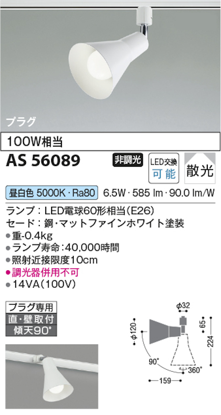 コイズミ照明 AS56089 スポットライト 非調光 散光 プラグタイプ 100W相当 昼白色 マットファインホワイト