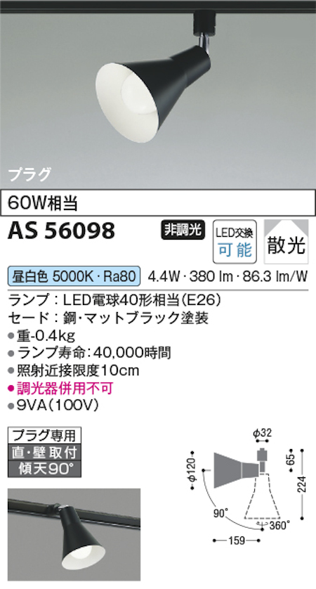 コイズミ照明 AS56094 スポットライト 非調光 散光 プラグタイプ 60W相当 温白色 マットファインホワイト