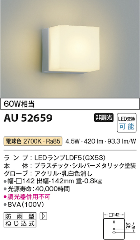 コイズミ照明 AU52659 LEDエクステリアライト 防雨型 白熱球60W相当 電球色 色シルバーメタリック