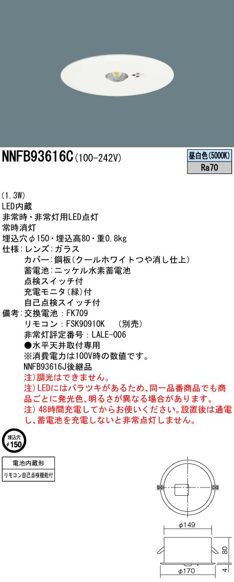 パナソニック NNFB93616C LED非常用照明器具 埋込型 昼白色 非常時点灯30分間 埋込穴φ150 リモコン自己点検機能付 中天井用(~8m) リモコン別売