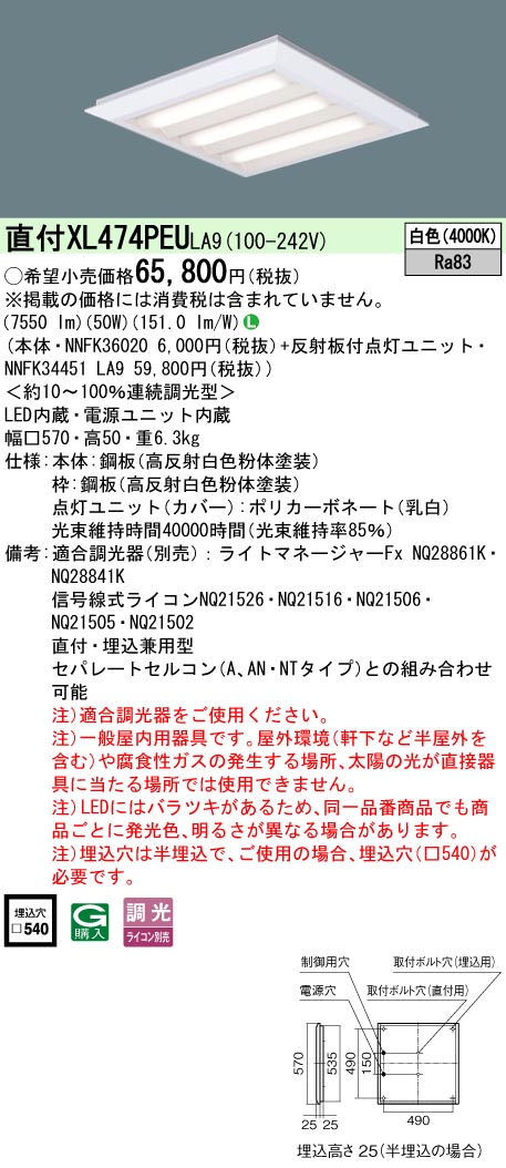 パナソニック XL474PEFLA9 スクエアシリーズ 直付 埋込兼用型 下面開放タイプ FHP32形×4灯相当タイプ 温白色